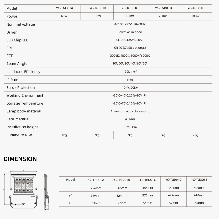 | YC-TGD01-50W | 358*294*52 | 50w | Heat sink Aluminum body,Glass,Bracket,304 screws, PCB, LENCSÉS. |
