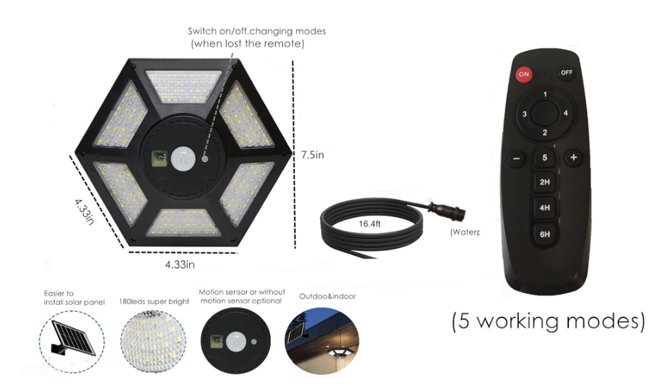 4.IP65 Vízálló és egyszerű telepítés A napelem és a lámpa különállóan vannak kialakítva, és egy 16,5 láb hosszú vezetékkel vannak összekötve.